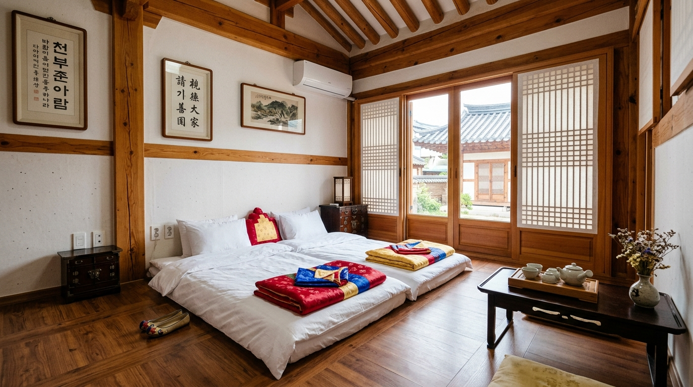 전주다운 분위기를 원하면서도 예산을 과하게 올리고 싶지 않다면 일반 한옥스테이가 가장 균형이 좋습니다. 검색 스냅샷을 보면 전주 명문가 한옥스테이 8만 원, 일락당사랑채 6만6,500원, 한옥마을 내 일부 게스트하우스형 한옥 객실은 13만2,050원 수준이 확인됩니다. 즉 2박 숙박비는 대략 13만~26만 원 선에서 형성된다고 볼 수 있습니다. 특히 한옥마을 안쪽에 머물면 경기전, 전동성당, 골목 산책 코스를 걷기로 소화하기 쉬워 현지 교통비가 크게 늘지 않습니다. 이 경우 총비용은 숙박 13만~26만 원, 식비 14만~18만 원, 교통 1.2만~2.2만 원, 관람 0.6만~2만 원을 더해 30만~48만 원 정도로 잡는 방식이 현실적입니다.