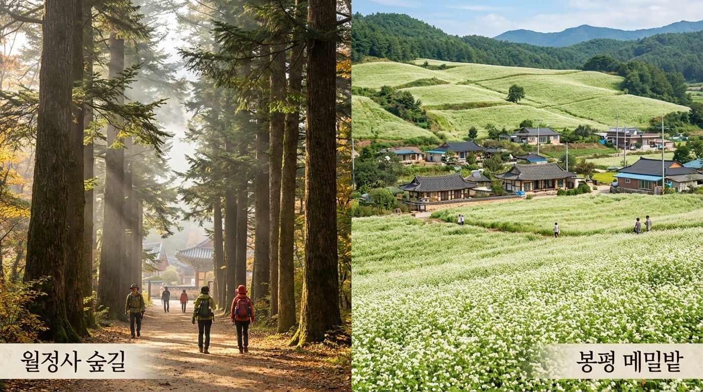 봄·여름에는 오대산 산책 중심으로, 가을에는 봉평 문학 테마를 얹는 방식이 어울립니다. 예시로 1박 2일이라면 1일차 오전 대관령 목장→오후 알펜시아 일대 전망·산책→저녁 횡계에서 식사, 2일차 오전 월정사 전나무숲길→오후 봉평 메밀음식·카페로 마무리하는 구성이 무난합니다. 2박 3일은 여기에 ‘선재길 걷기’와 ‘허브나라농원 관람’을 별도 반나절로 떼어내면 이동 피로가 줄어듭니다. (한국관광공사)